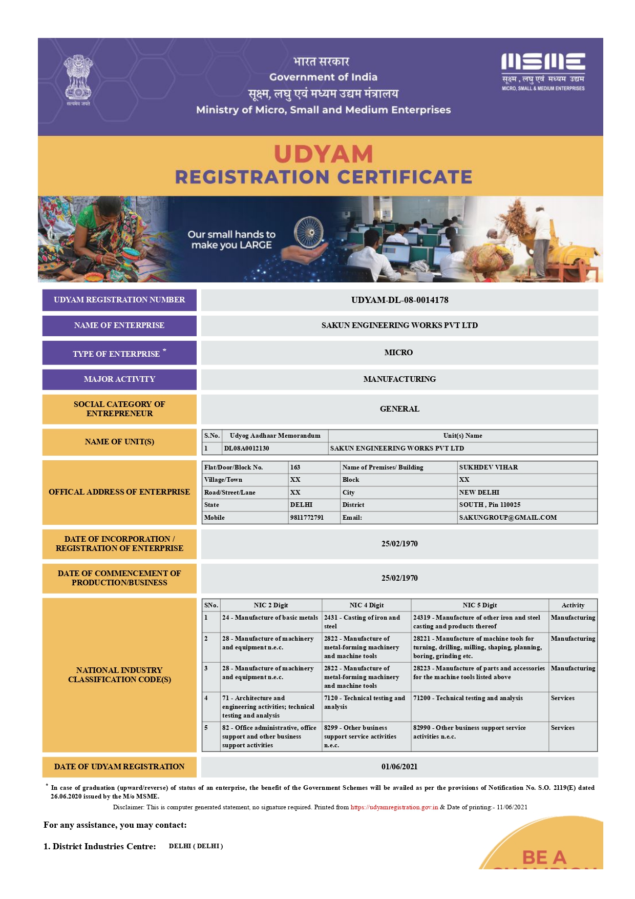 Registered under Udyam MSME India which recognizes our company as a certified manufacturing enterprise.